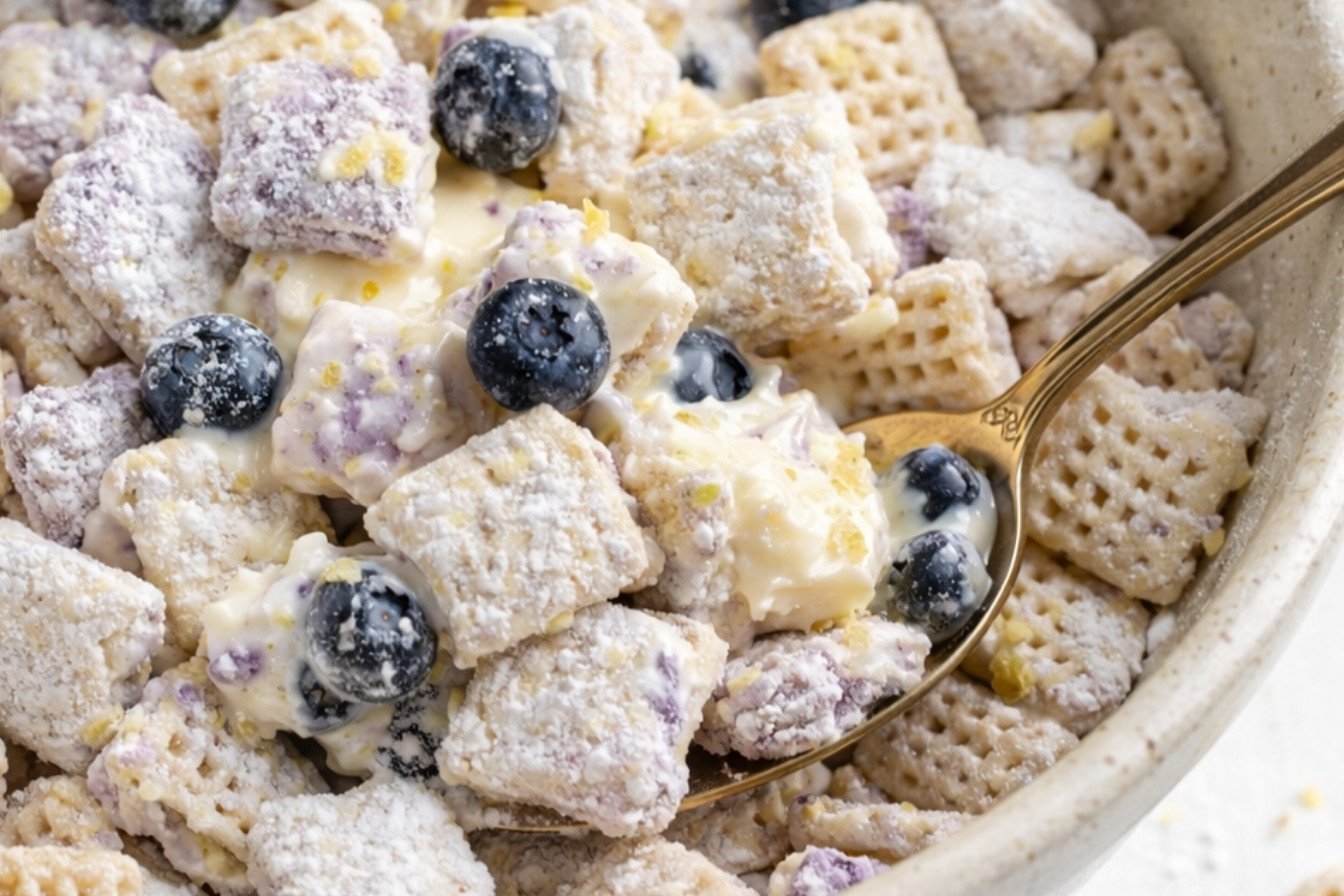 Blueberry Lemon Cheesecake Puppy Chow is a sweet, tangy, and addictive snack mix. Coated in a creamy lemon cheesecake mixture and dusted with powdered sugar and blueberries.