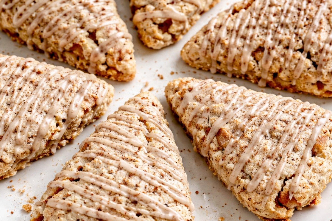 Warm, spiced scones filled with tender diced pears and topped with a sweet cinnamon glaze.