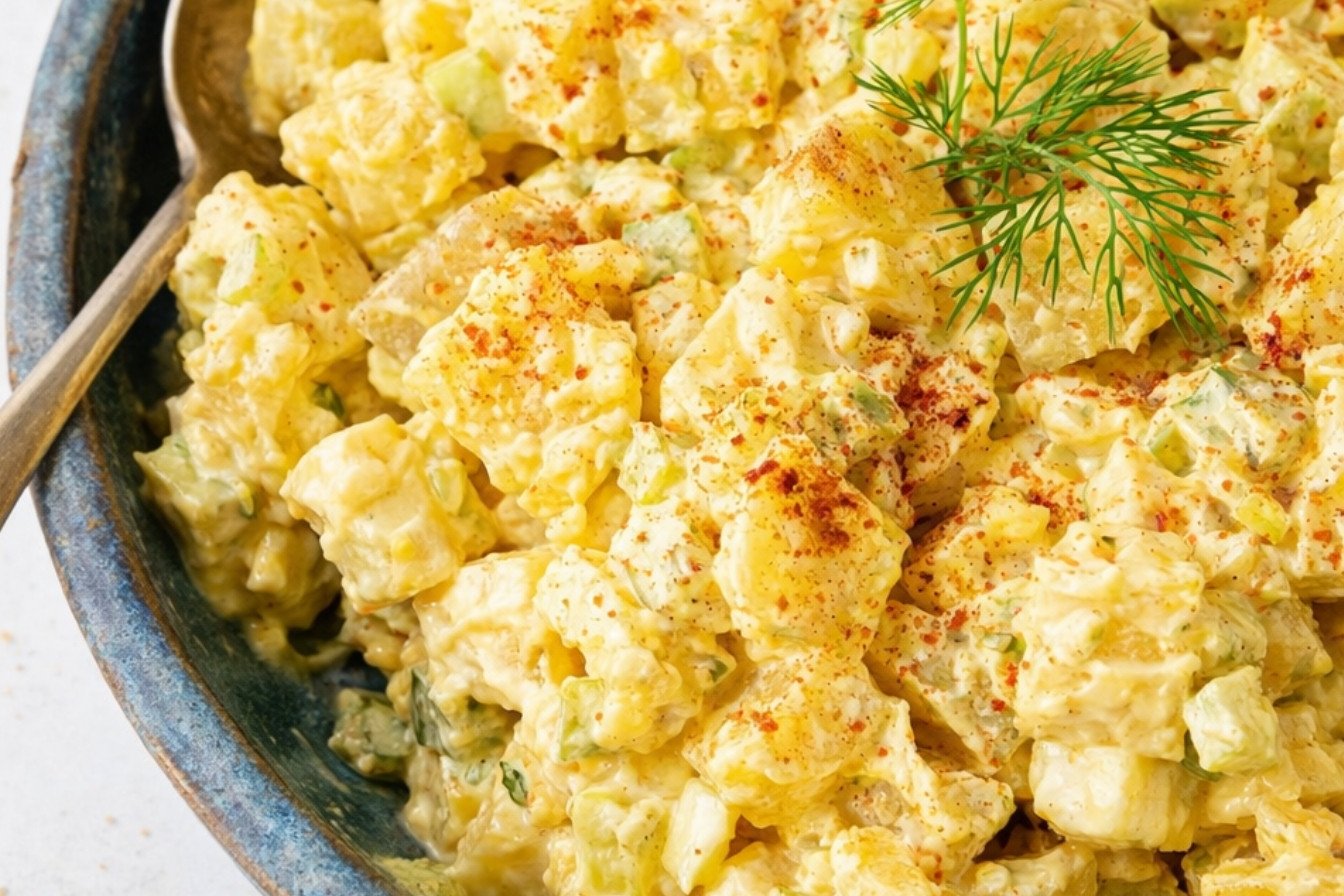 A classic, creamy potato salad with hard-boiled eggs, crunchy celery and pickles, and a tangy mustard-mayo dressing.