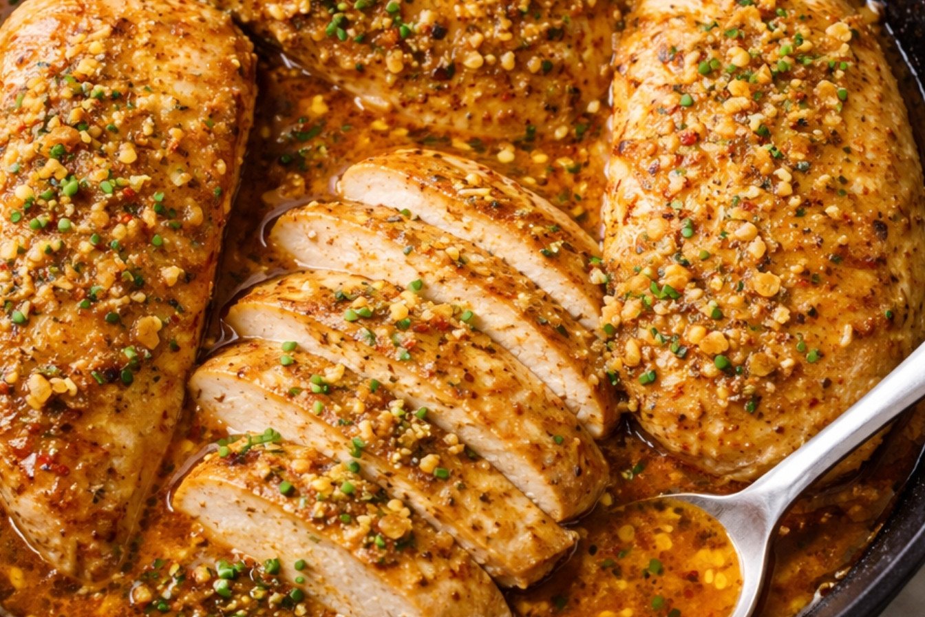 It starts with simple chicken breasts. They get cooked in a rich, herby butter sauce. The sauce has garlic, shallot, and Dijon mustard. It also has a kick from horseradish and smoked paprika. Fresh parsley, chives, and thyme make it taste garden-fresh. It is a full meal from one pan. For another one-pan wonder, check out this broiled chicken with pan gravy.