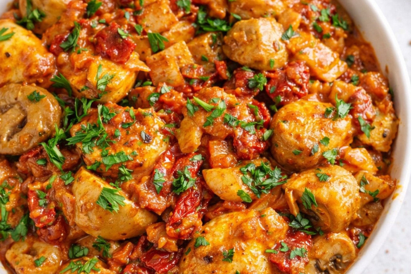 A rich and flavorful one-pan meal featuring tender chicken in a creamy coconut milk sauce with sun-dried tomatoes, olives, and aromatic spices.