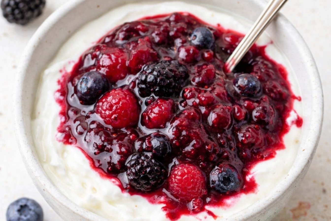 A simple, vibrant mixed berry compote, sweetened and flavored with a hint of lemon and fresh mint, perfect for topping creamy yogurt.