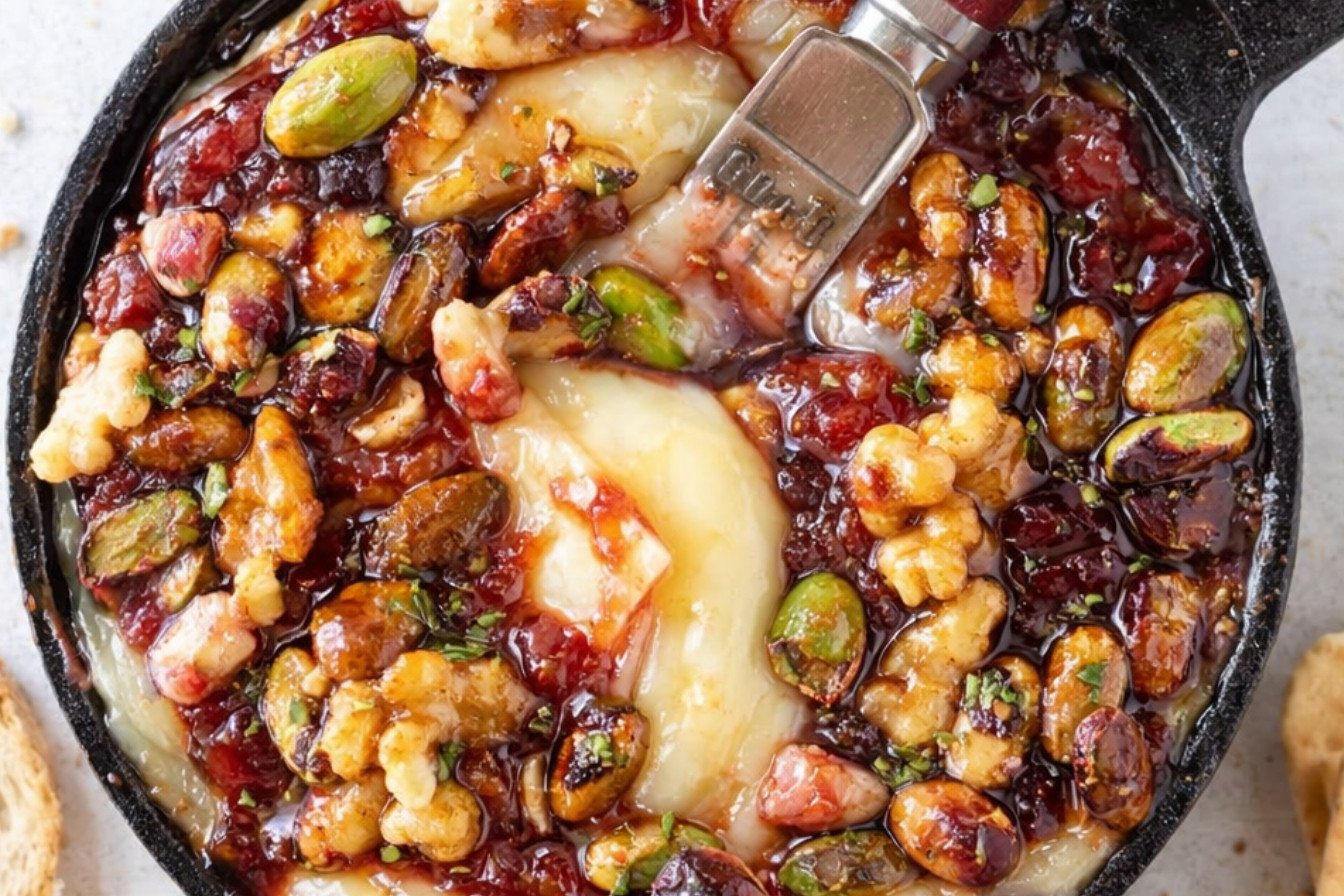 A warm, gooey baked brie topped with sweet jam, crunchy honey-glazed nuts, and fresh thyme. Perfect for sharing as an elegant appetizer.