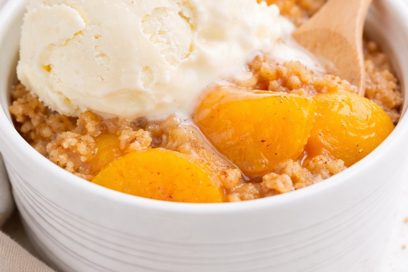Our recipe uses a slow cooker, so no oven is needed. You can also try a no-bake dump cake method in a microwave-safe dish. Layer peaches and dry cake mix. Dot with butter and microwave until bubbly. It’s not quite the same, but it’s fast and satisfying.