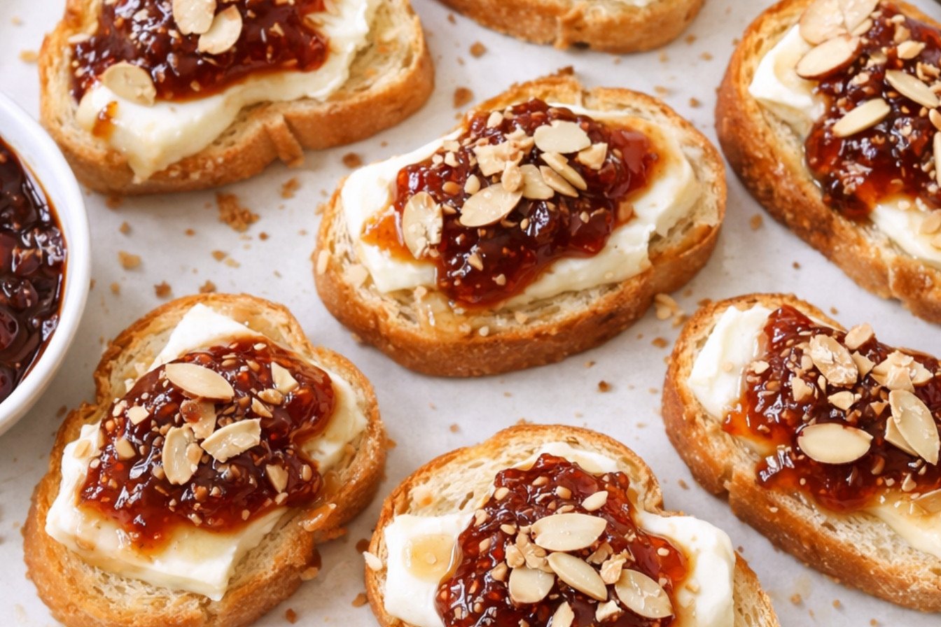 A perfect blend of sweet and savory, these easy crostini feature crispy baguette, creamy brie, and sweet fig preserves, topped with toasted almonds.