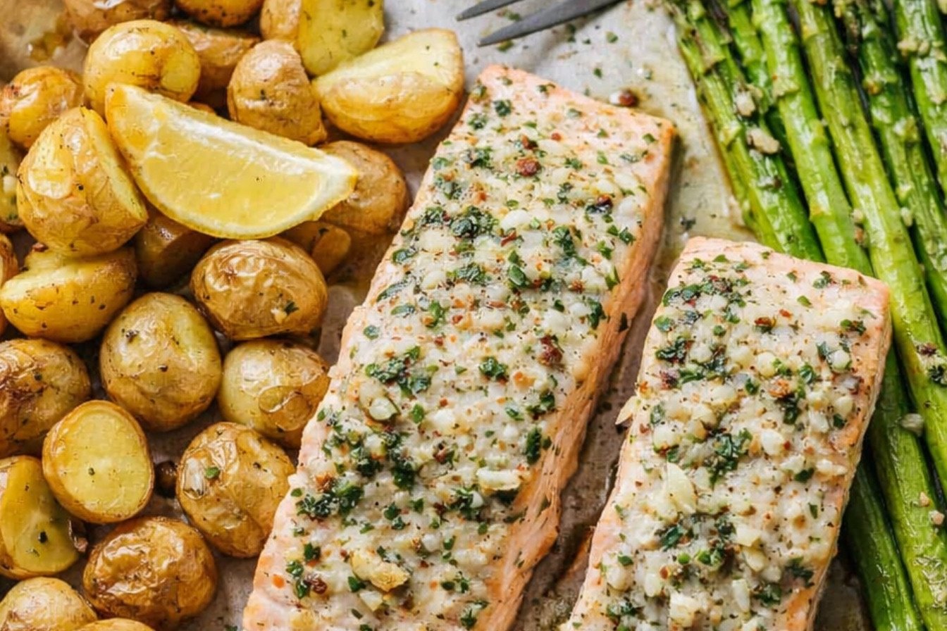 Sheet Pan Garlic Butter Salmon with Roasted Potatoes and Asparagus