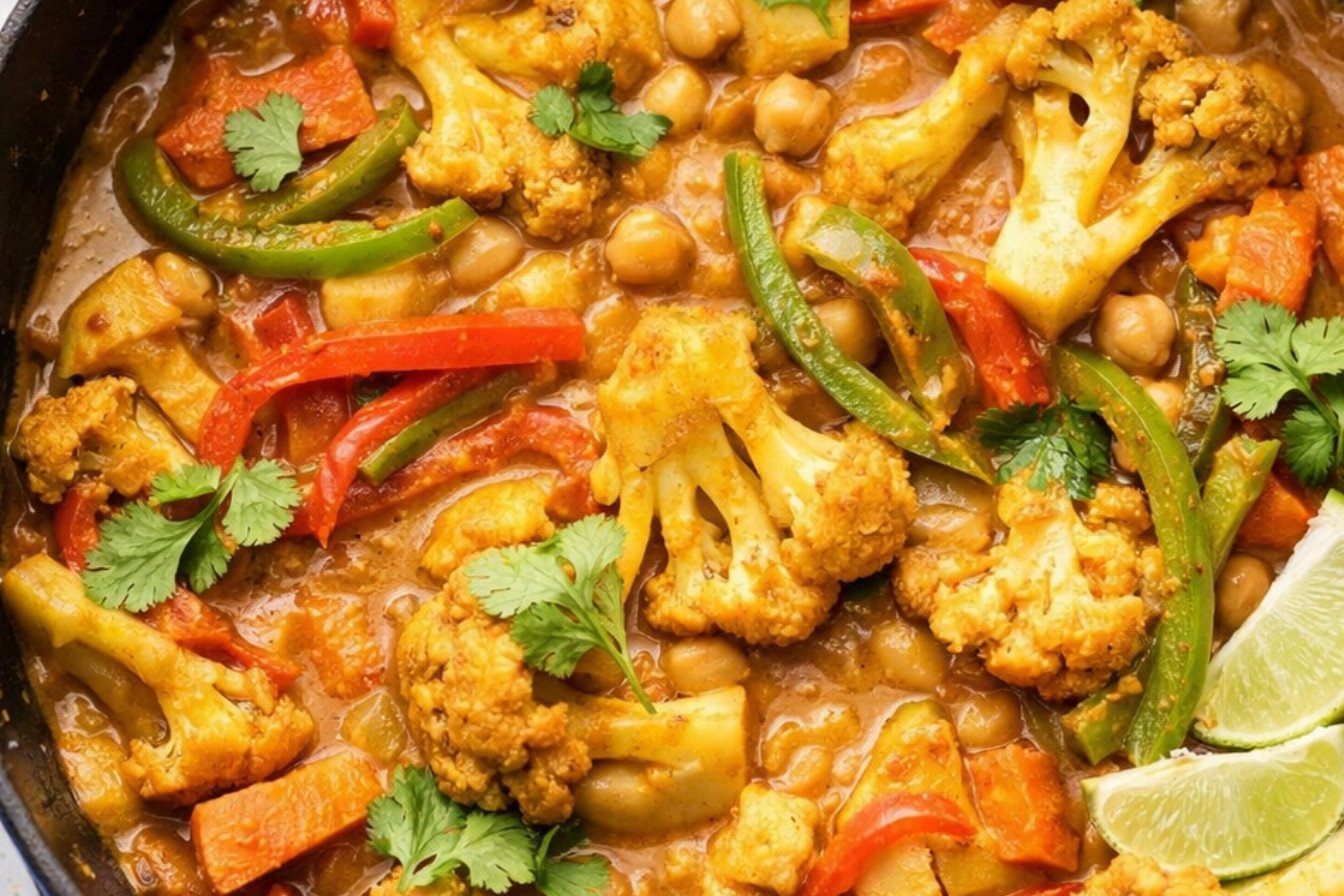 A vibrant and hearty vegan curry featuring golden cauliflower, sweet potatoes, and chickpeas simmered in a rich, spiced coconut milk sauce.