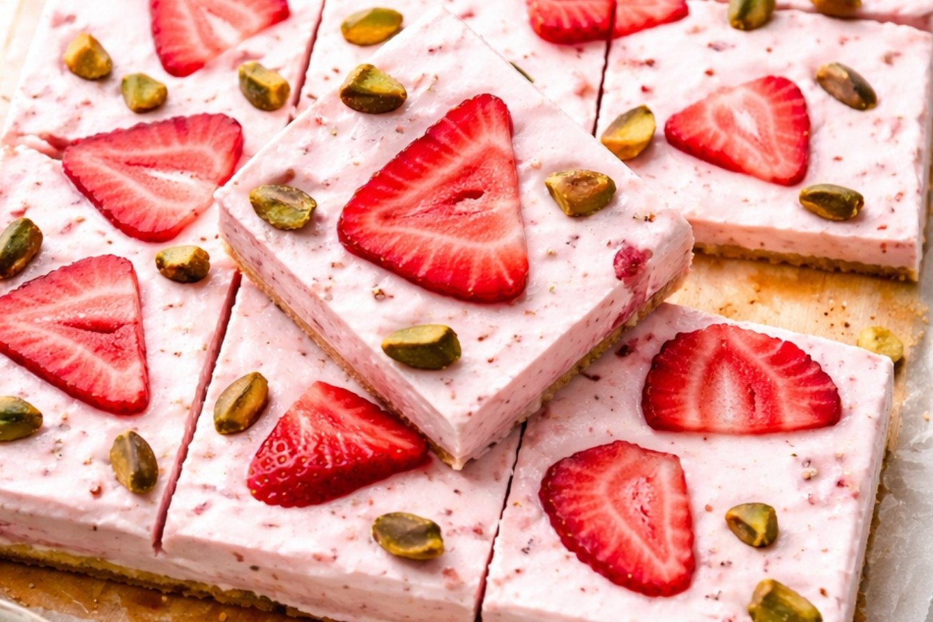 A sweet, tangy, and healthy frozen treat made with blended Greek yogurt, fresh strawberries, honey, and pistachios.