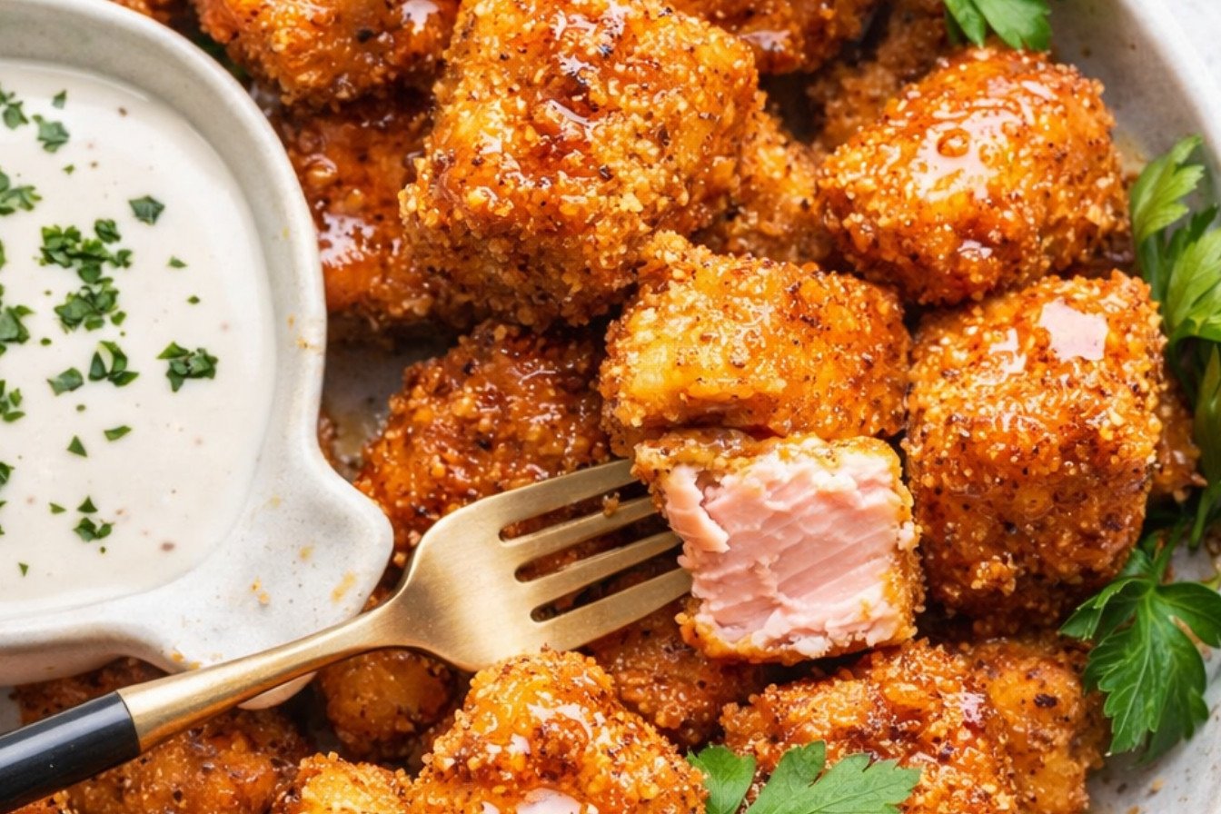Crispy, seasoned salmon bites coated in panko and air-fried or baked, then tossed in a spicy, buttery hot honey sauce.