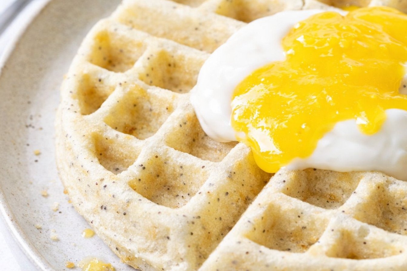 - Once done, remove the waffles and place them on a wire rack to cool slightly. Serve with Greek yogurt and lemon curd.