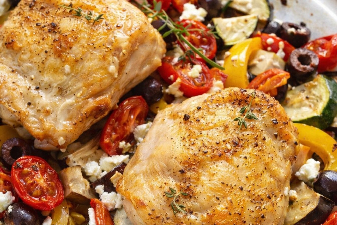 A vibrant and easy one-pan meal featuring crispy chicken thighs roasted atop a medley of Mediterranean vegetables, finished with briny olives and tangy feta.