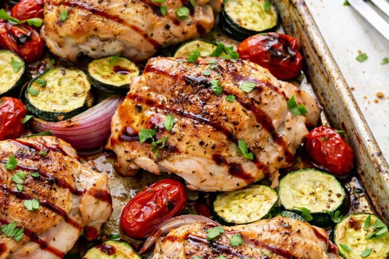 A simple and flavorful one-pan meal featuring juicy, herb-roasted chicken thighs with caramelized zucchini, tomatoes, and shallots.