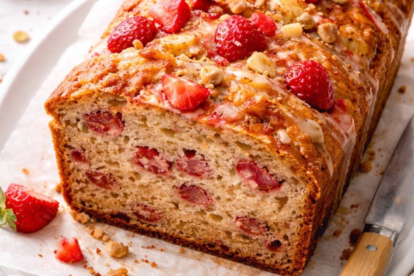 A moist and fruity quick bread bursting with ripe bananas and fresh strawberry chunks, perfect for breakfast or a sweet snack.