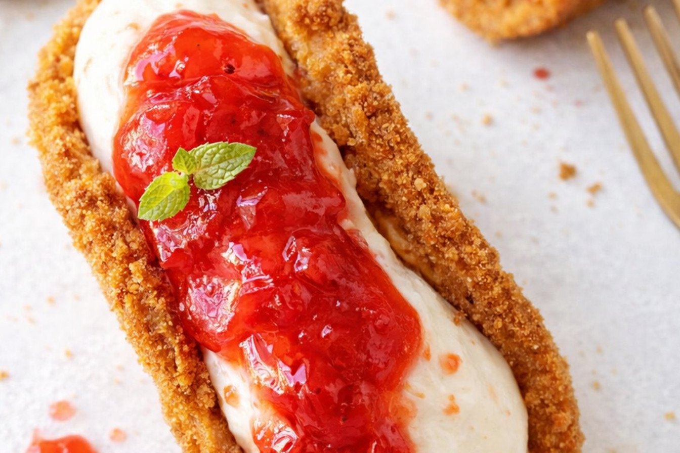 It is a fun dessert. A small, crispy tortilla shell holds creamy cheesecake filling. Sweet strawberry sauce is spooned on top. It has all the flavors of a classic cheesecake. But it is in a fun, handheld form. It is perfect for parties or a special family treat.