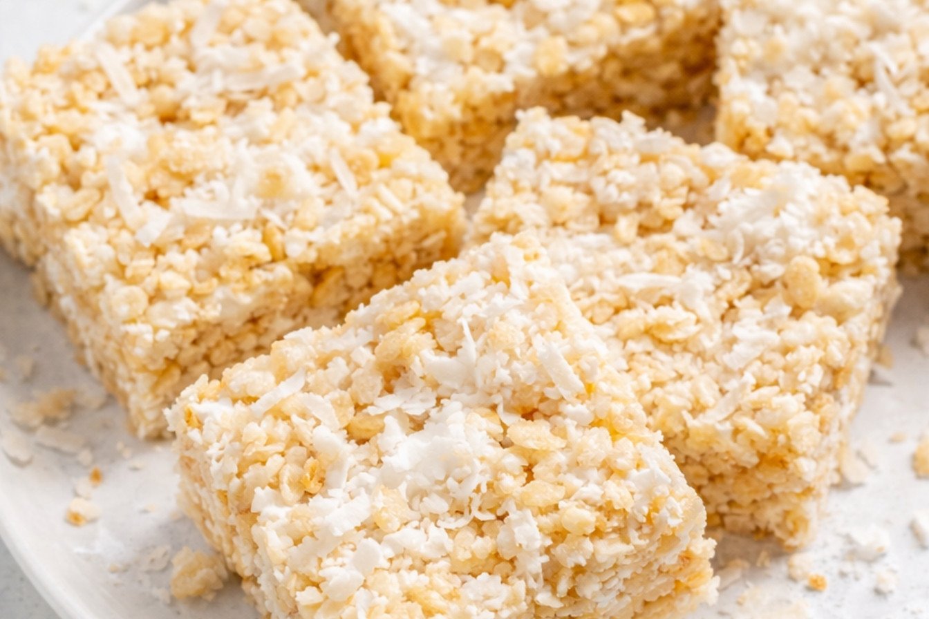 - Immediately sprinkle additional sweetened shredded coconut over the top of the Coconut Rice Krispie Treats.