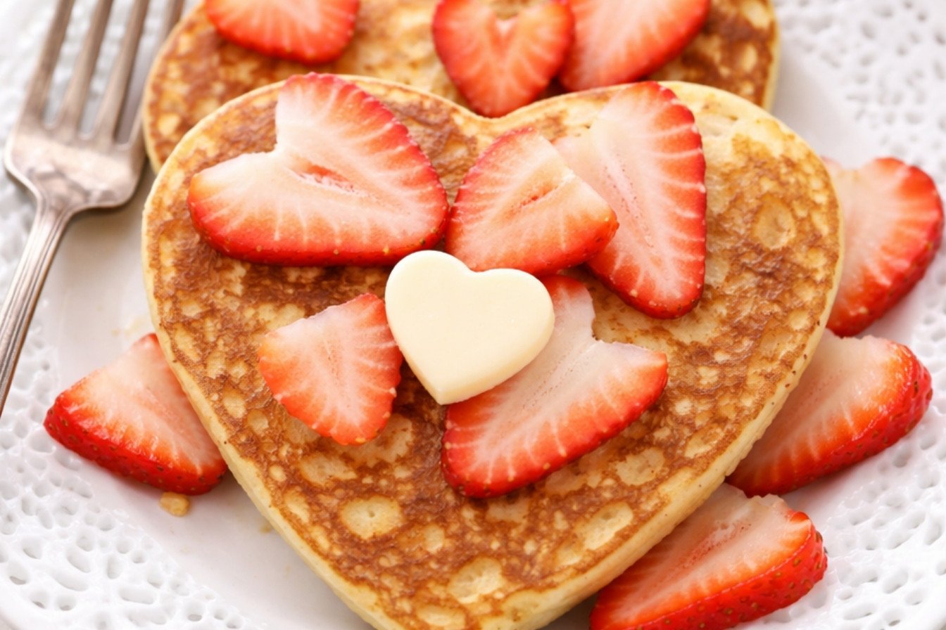Start Valentine’s Day with a sweet and wholesome breakfast of heart-shaped pancakes, perfect for a special morning treat.